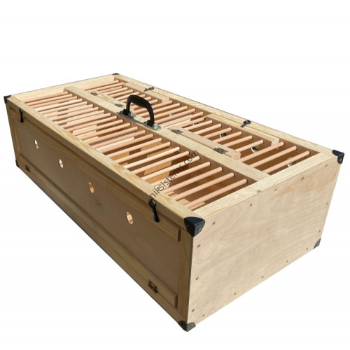 Функционална клетка за транспортиране на гълъби. Има стандартна дръжка и крака от шперплат. Структура от масивна иглолистна дървесина, изработена чрез техниката на шипове. Клапата е снабдена със стъпала с диаметър 8 мм. с оптимално разстояние, осигуряващо безопасността на птиците. Страните на клетката са направени от шперплат от твърда дървесина с дебелина 4 мм., като едната е отваряща се. Снабдена е с вентилационни отвори с диаметър 25 мм. Дъното на клетката е от фазер с дебелина 3мм.