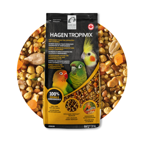 Храна микс от екзотични зърнени храни, бобови растения, фъстъци, плодове, зеленчуци и екструдирани гранули, 908 гр. - Hagen Tropimix Premium Enrichment Food for Cockatiels and Lovebirds