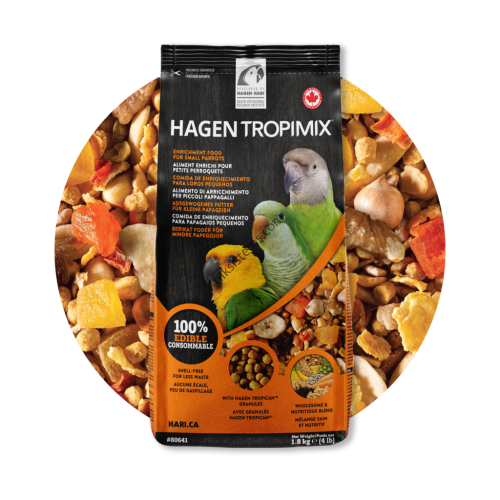 Tropimix за малки и средни папагали е здравословна и питателна първокласна хранителна смес от екзотични зърнени храни, бобови растения, фъстъци, плодове, зеленчуци и екструдирани гранули Tropican. Със 100% годни за консумация съставки, подходящи за хора, Tropimix за малки папагали не съдържа никакви мръсни люспи или черупки; елиминирайки отпадъците и риска от патогени. С натурален фъстъчен вкус, който птиците обичат, той е богат на жизненоважни хранителни вещества и първокласни източници на протеини, осигуряващи силен растеж на перата и здрави кости за домашните птици.